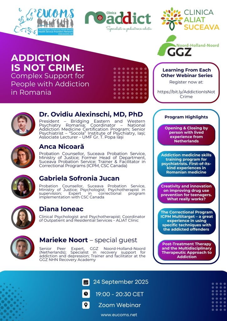 This webinar, part of the EUCOMS Learning from Each Other series, brought together Romanian professionals and international voices to discuss new approaches to addiction care. The event was held in collaboration with GGZ Noord-Holland Noord (Netherlands), NoAddict Clinic Iași, ALIAT Clinic Suceava, and the Psychiatric Hospital Siret.